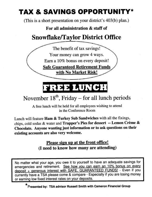 403(b) Agent Offers 10% Bonus, Free Lunch and Guaranteed Returns