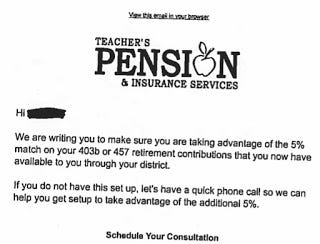 If you are a teacher and you receive the e-mail featured above, would you not think that your school district is offering a match of 5% if you begin contributing to your employer's 403(b)? I know that's how I would read it if I weren't in the financial services business.
