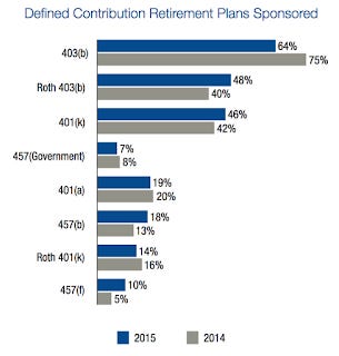 "Perhaps the main finding from the 2015 edition of the study is the incidence of 403(b) plans among institutions of Higher Education. For the first time, fewer than two out of three institutions (64%) sponsor a non-Roth 403(b) plan. To this day, 403(b) plans have been the dominant type of plan in the Higher Education sector (75% in 2014), but 401(k) plans have become more common and are now offered by nearly half (46%) of institutions to at least some segments of the workforce. Greater workforce mobility between corporate and Higher Education among researchers and staff, the rise of the for-profit Higher Education sector, and economic pressure to streamline retirement benefits all contribute to the trend. The rise of the 401(k) plan will likely continue into the future as Higher Education institutions compete for talent in the labor market."