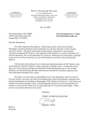 So I post a link to an article from the Union Tribune regarding potential nefarious activities by a county official, Dan Puplava (click on the above title to go to that post). Today I get a letter from his attorney threatening me if I don't remove the link and the picture (that of a what the attorney says is a Used Car Salesman). Funny, I'm pretty sure that I can link to articles from other publications as long as those publications don't mind me linking to them.