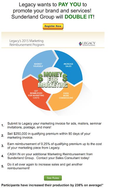 Basically, this company (an IMO) will reimburse insurance agents for their marketing expenses...but only if they sell certain products that pay commissions. As always, no mention of the client's best interest.