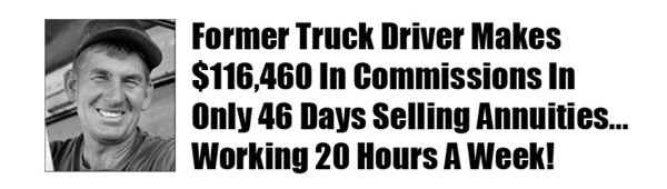 You may not know it, but Mark Miller, a former truck driver (pictured above) is purported to have "...made more in commissions in a month than he made driving a truck for over 2 years. Now he only works 20 hours a week." Or so the advertisement for this annuity sales system would lead you to believe.