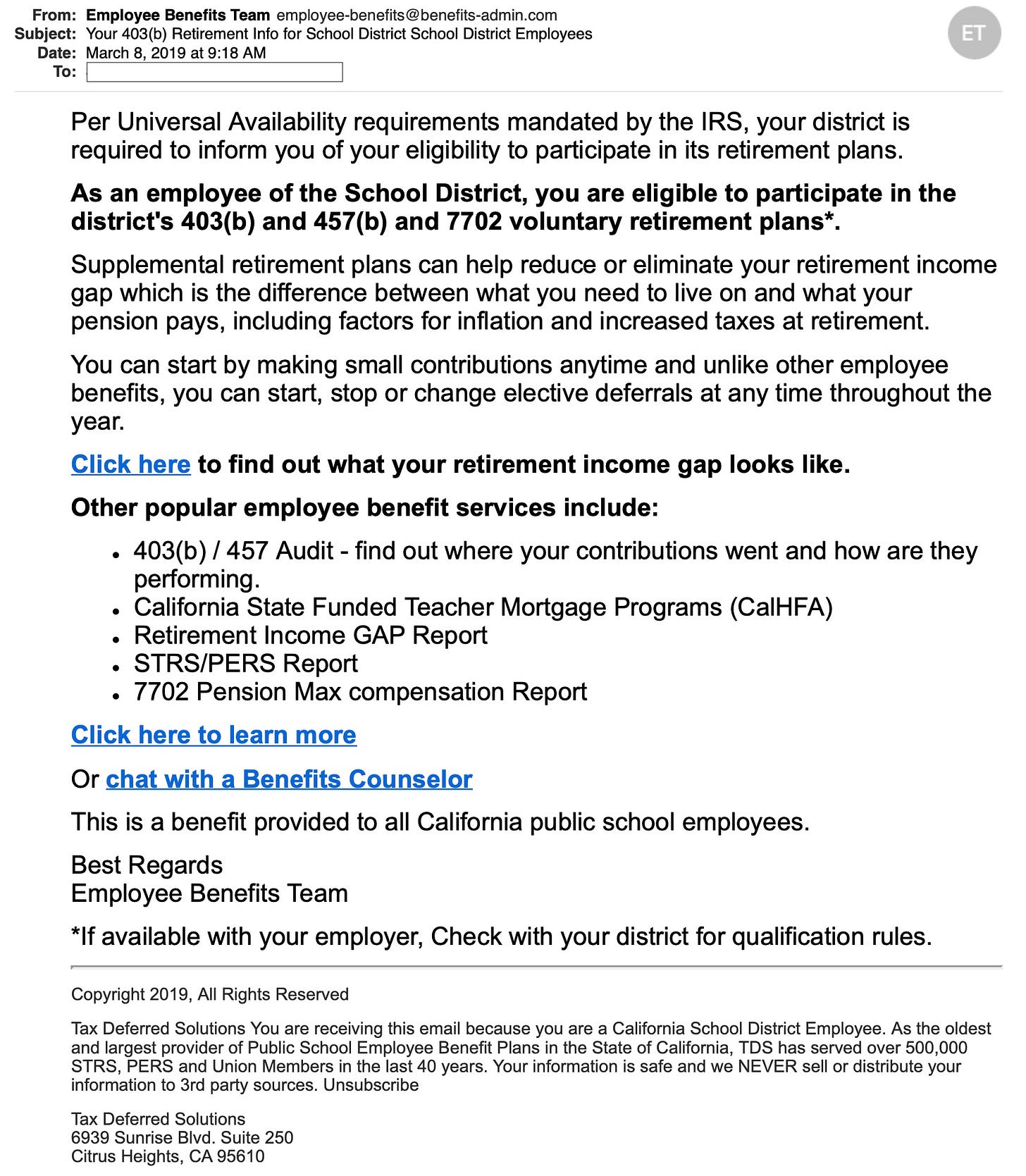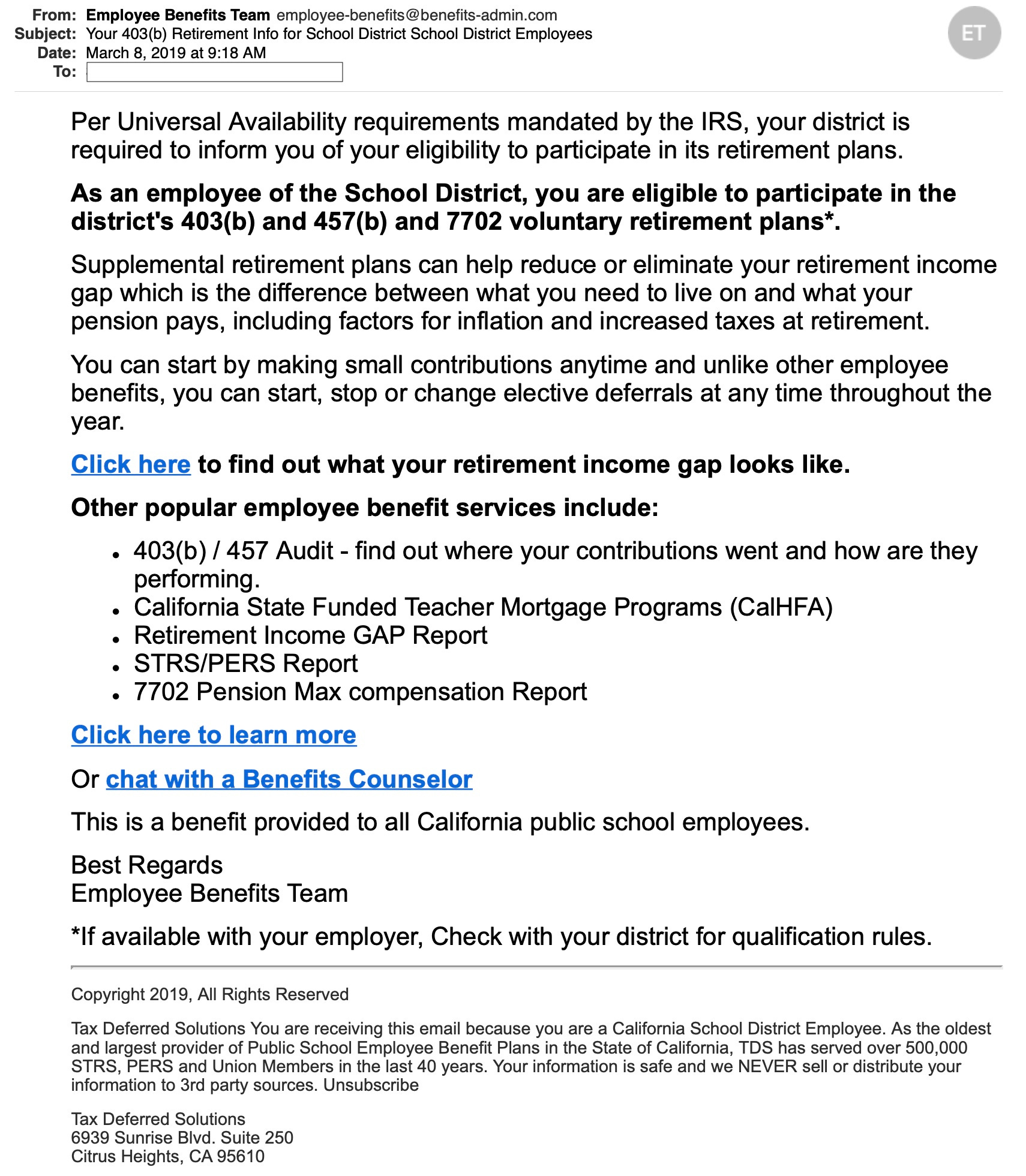 I’ve been critical of TDS Group’s methods for decades and especially of the misleading spam e-mails the company sends to teachers. Here is an example:
