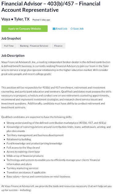 This position puts the winning candidate into a situation where she/he will be educating higher education professors and employees on their 403(b) and 457(b) plans. They'll also be "counseling" them on retirement and investments. You'll notice that the skills that a qualified candidate are expected to have actually have nothing to do with the skills that a good financial advisor should have and their is no real competency requirements. While they accept recent college grads, no degree seems to be required. No Certified Financial Planner designation is required, in fact no real background in financial services is needed. I'm unclear how having "access to the Voya brand" qualifies as a skill (if it does, then only existing Voya people could apply...).